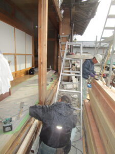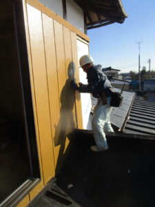 上部の漆喰壁部分には傷をつけない様に、丁寧に既存トタン外壁を解体していきます。