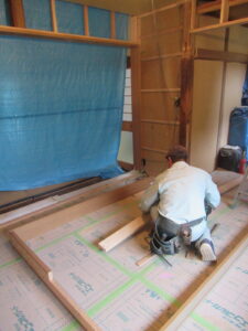 間取りを変更してのリフォーム工事ということから、土台、柱だけを残し全て解体して木工事が行われます。しっかりと断熱工事をしながら床、壁、天井を新設させて頂きます。