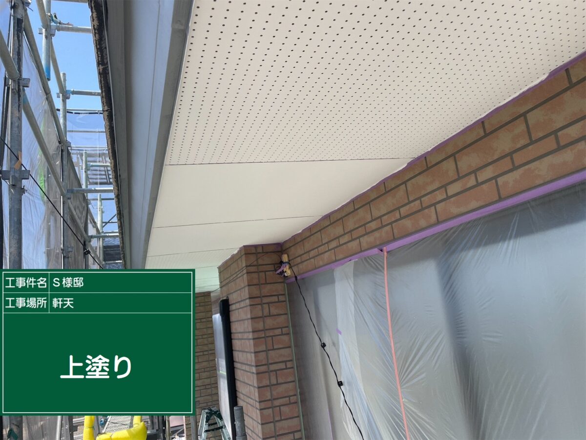軒天は屋根の湿気を外部に排出する役割があるので、耐水性が高く、防カビ・防藻効果のある軒天専用の塗料で塗装をします。