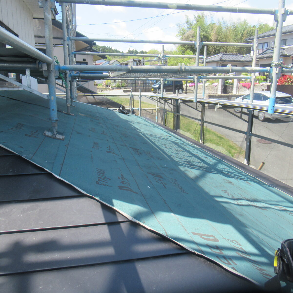 既存の屋根の上に直にトタンを葺いてしまうと貰いサビをしてしまう為、ルーフィングと呼ばれる油紙を敷いてから屋根を葺いていきます。
