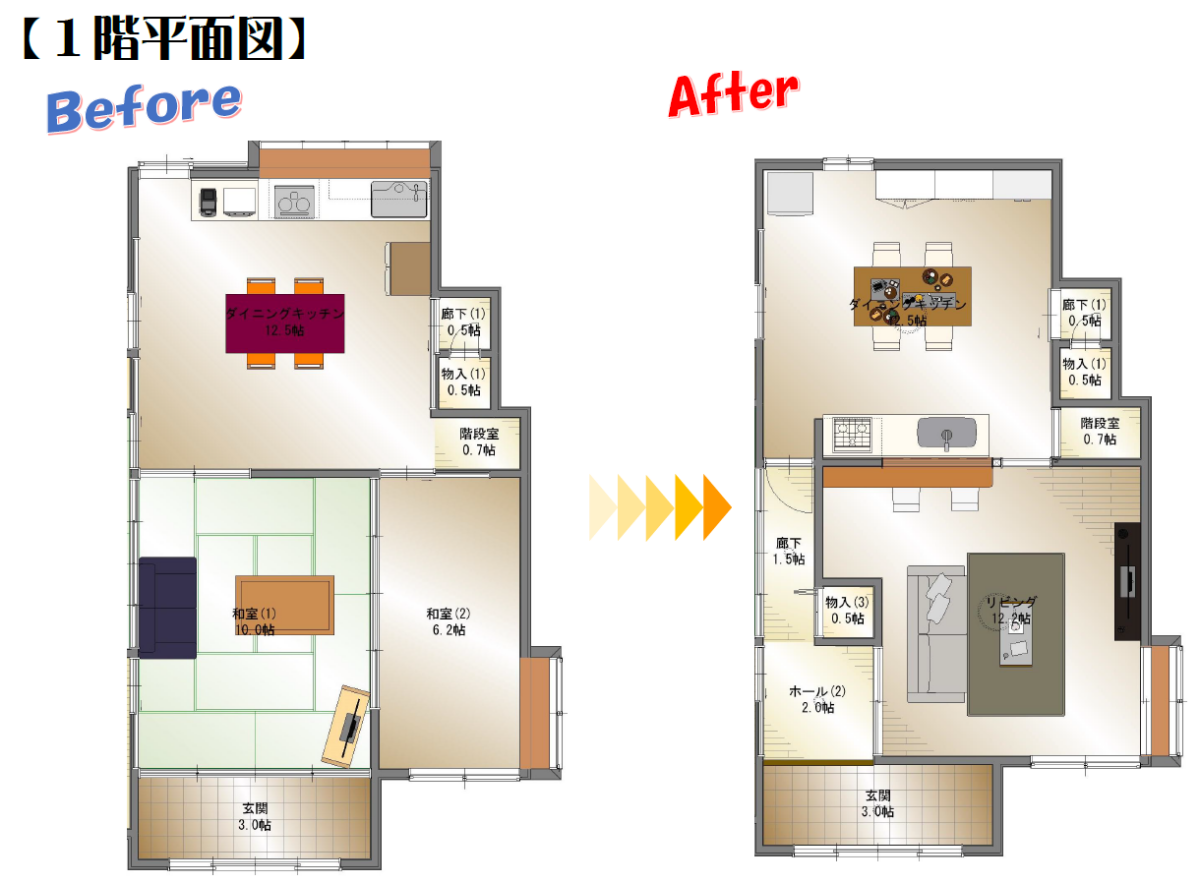 茶の間(和室2部屋)を広々としたリビングに!&家族と会話が楽しめる対面式キッチンに間取り変更リフォーム工事