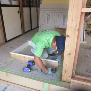 床の断熱工事が終わると、捨て貼りと言って12㎜の針葉樹合板を貼り、その上に12㎜のフローリング材を貼っていきます。そうする事で、強度のある丈夫な床に