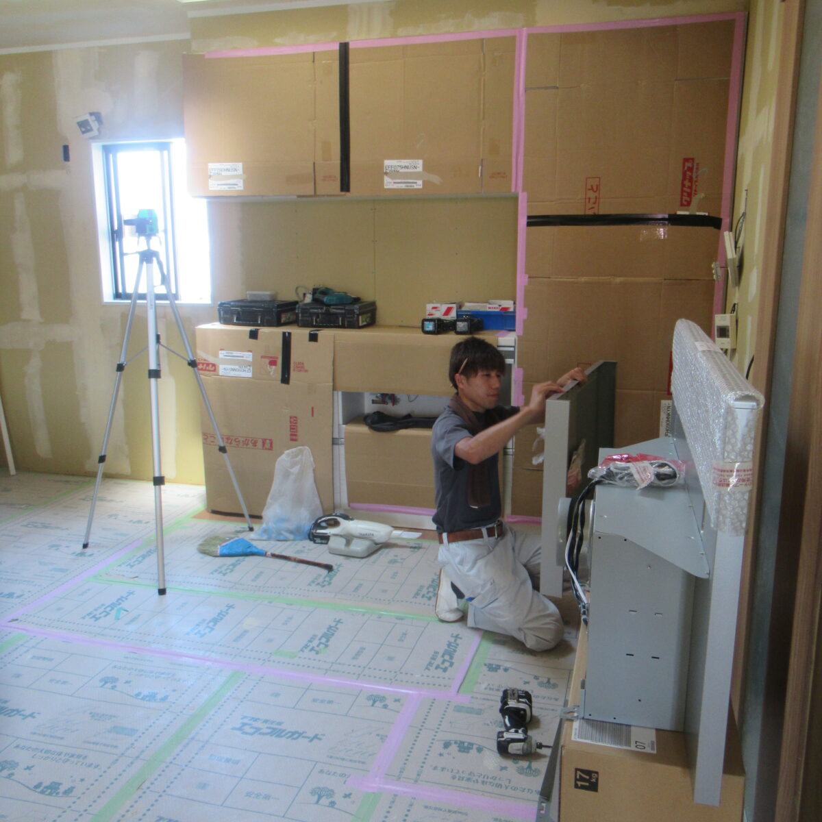 キッチンパネル貼付け、システムキッチン、キッチン収納の取付工事を行います。