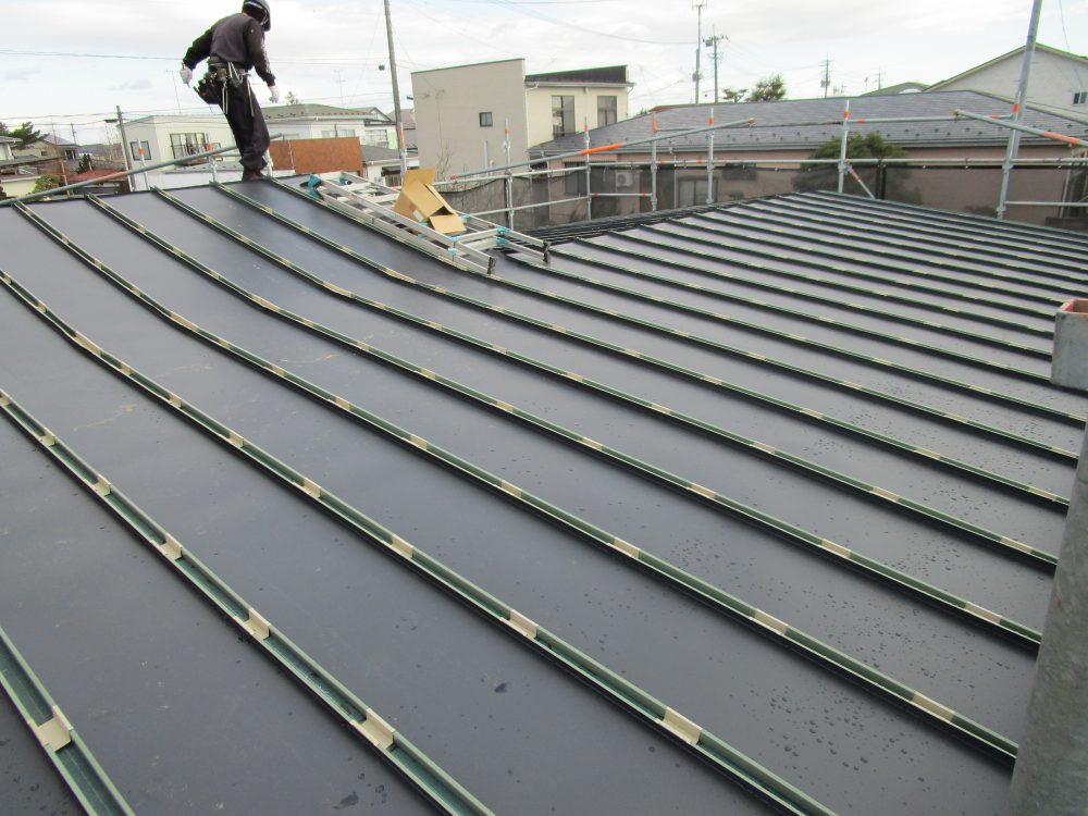 屋根下地の上に防水シート(ルーフィング)を貼付けます。