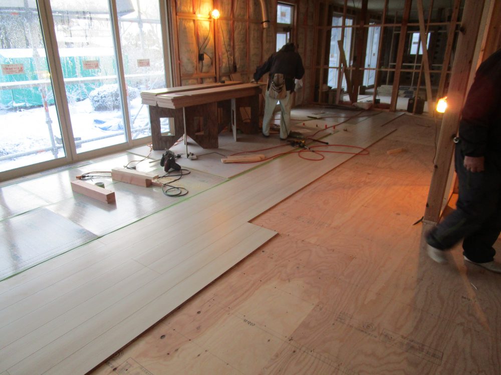 下貼りした合板の上に、化粧フローリングを一枚一枚丁寧に貼っていきます。
