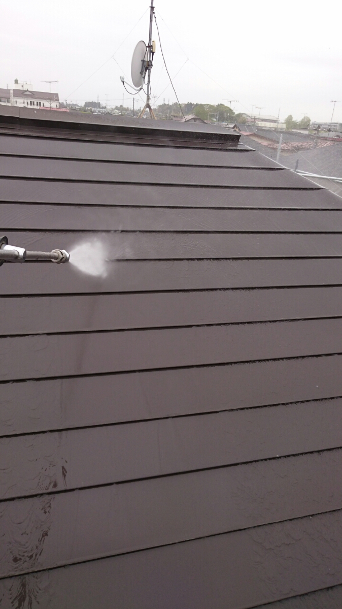 高圧洗浄機を使い、塗料がしっかりと密着するように、屋根の汚れをしっかりと落として、キレイに洗浄します。