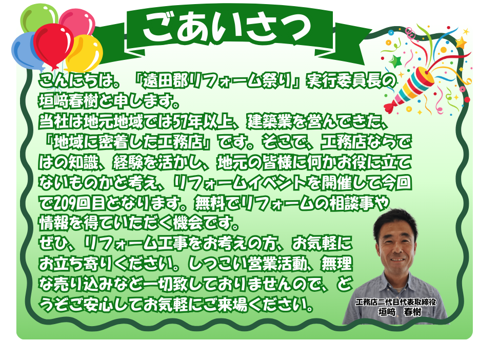 こんにちは「遠田郡リフォーム祭り」実行委員長の垣﨑春樹と申します。