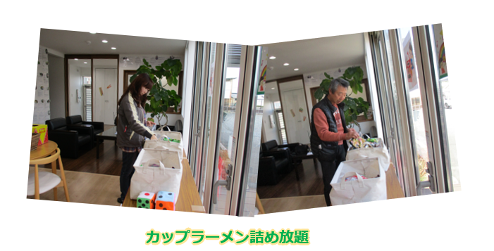 フランクフルトをふるまったり、「お楽しみ抽選会」や、「カップラーメン詰め放題」など、