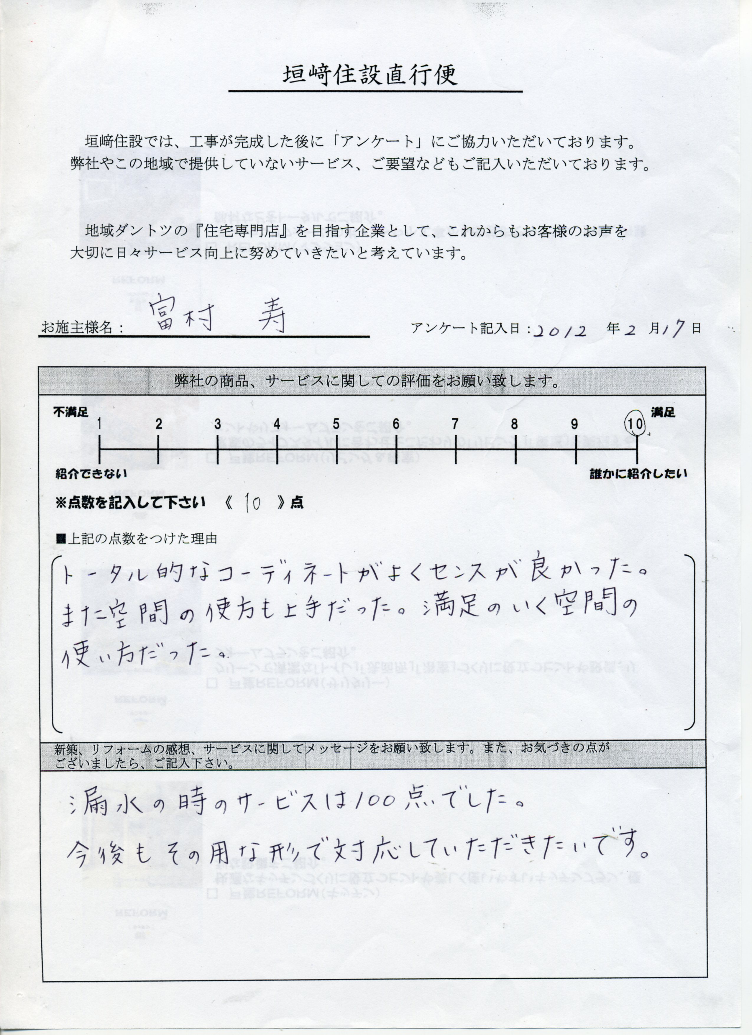 3月11日の震災時、だいぶ被災があっていつも頼んでいたR社。早速連絡したが一向に音沙汰がなくて10月下旬まで音沙汰がなくて困っていました。ところがある日、郵便箱を見たらPR用の垣﨑住設さんのチラシを見ました。そこでR社をお断りして垣﨑住設さんに頼んだところ、すぐに対応してくれました。冬も間近で本当に助かりました。