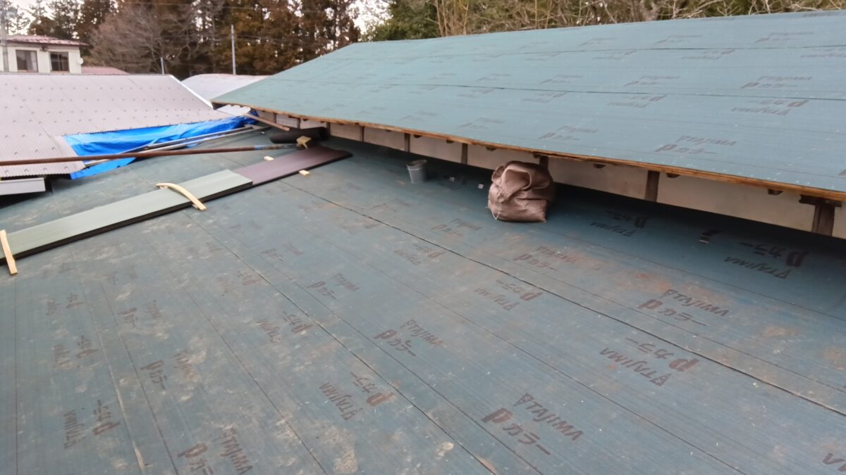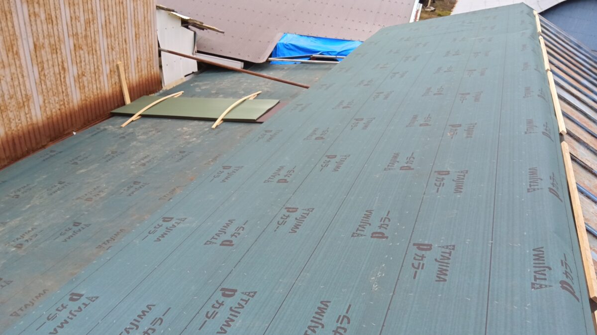 既存のトタンを剥がし、12㎜の針葉樹合板とルーフィング(防水シート)を貼りました。