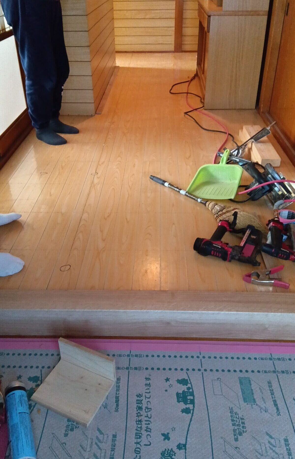 玄関から廊下にかけて、既存の床板の上にフローリングを重ねて貼る工事を行っています。