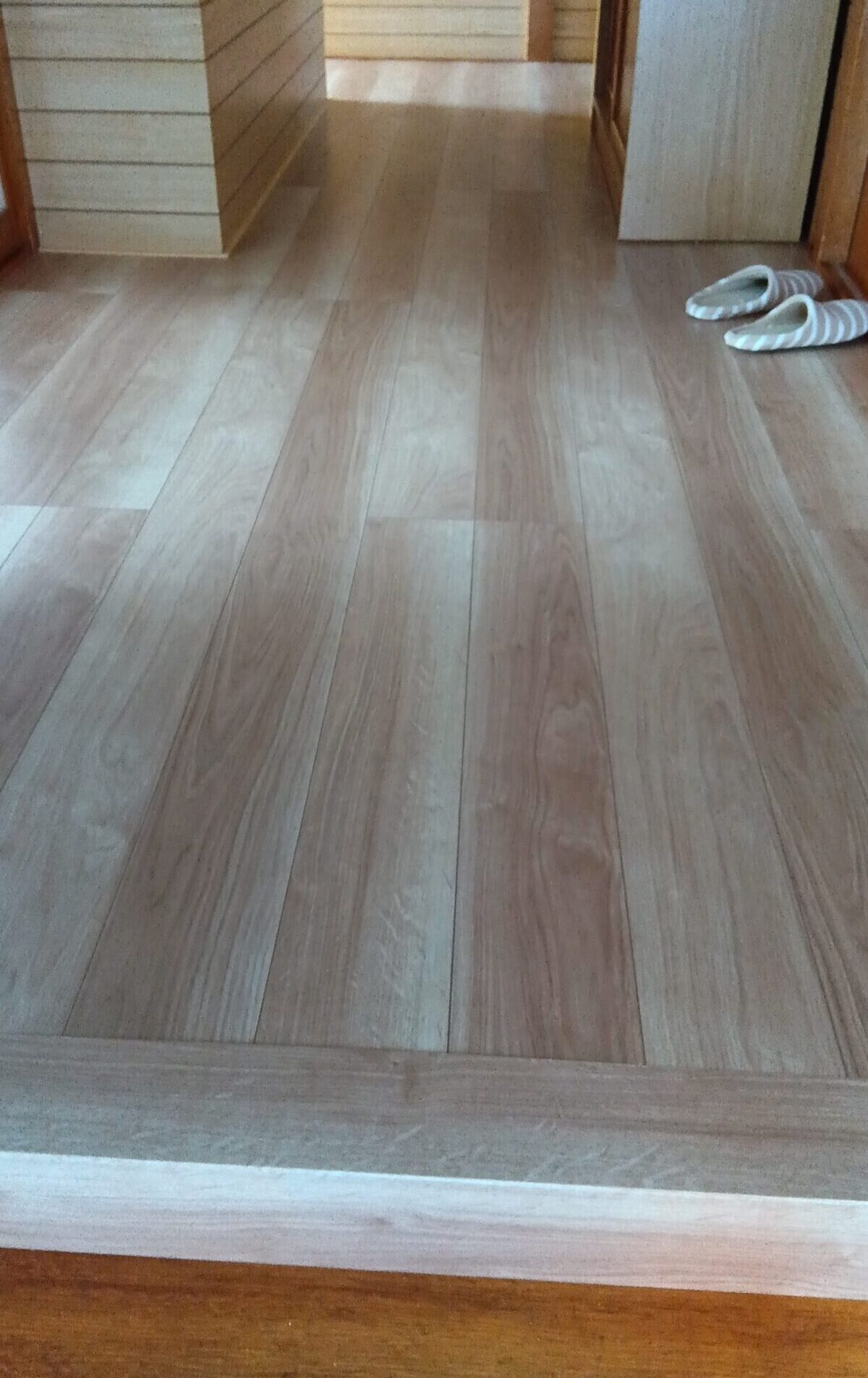 玄関から廊下にかけて、既存の床板の上にフローリングを重ねて貼る工事を行いました。