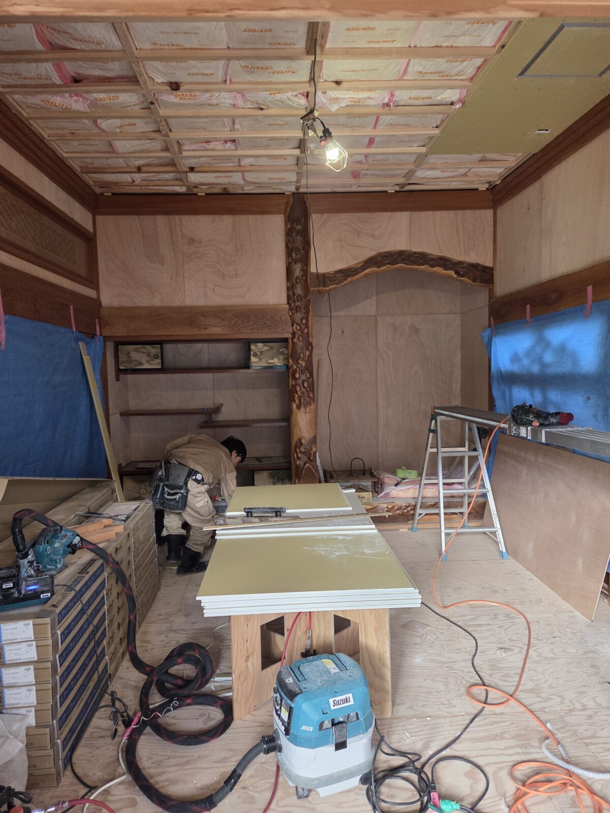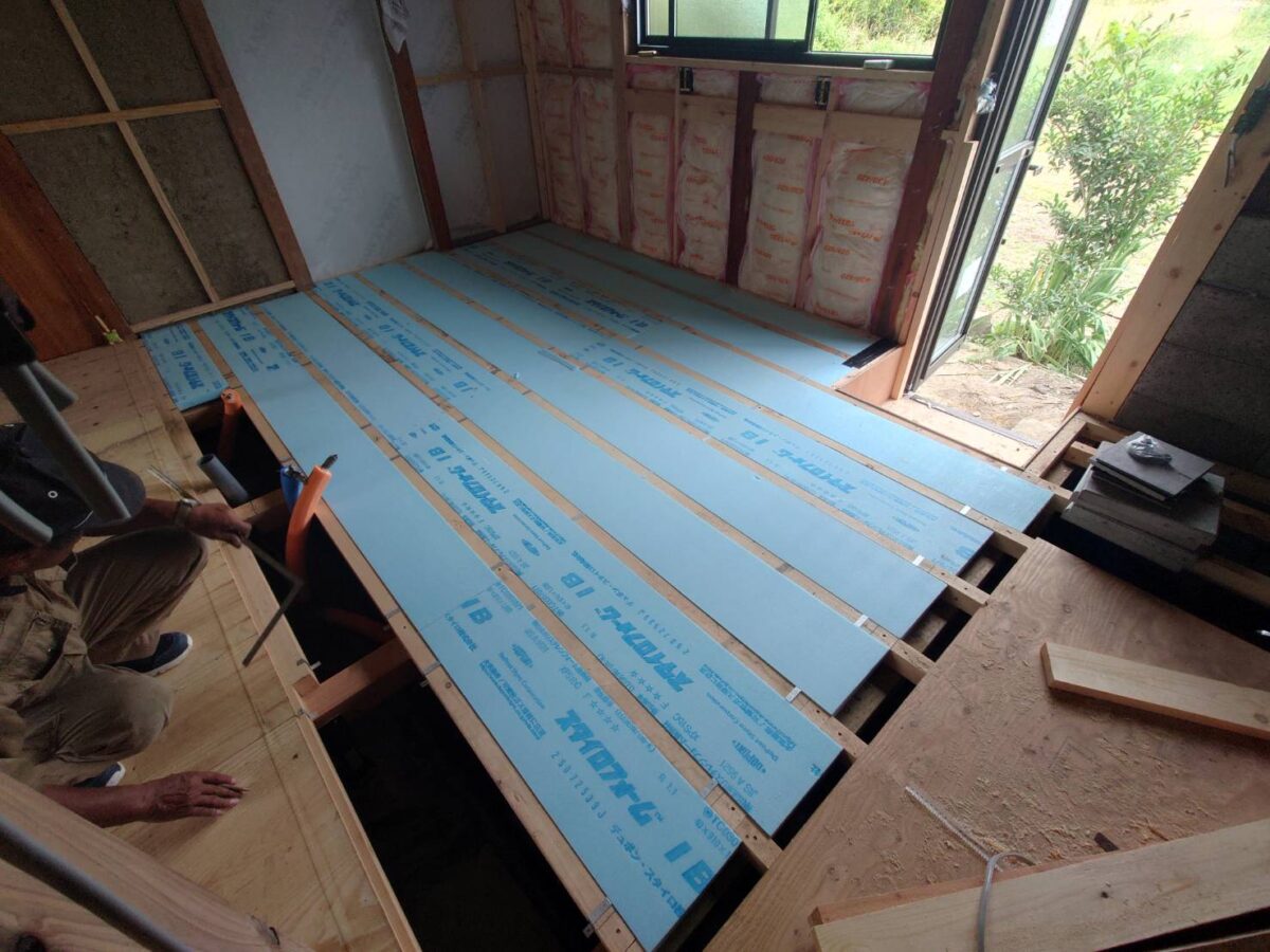 座敷の床と天井を解体し、根太と根太の間に断熱材を敷き詰めて断熱性を高めます。