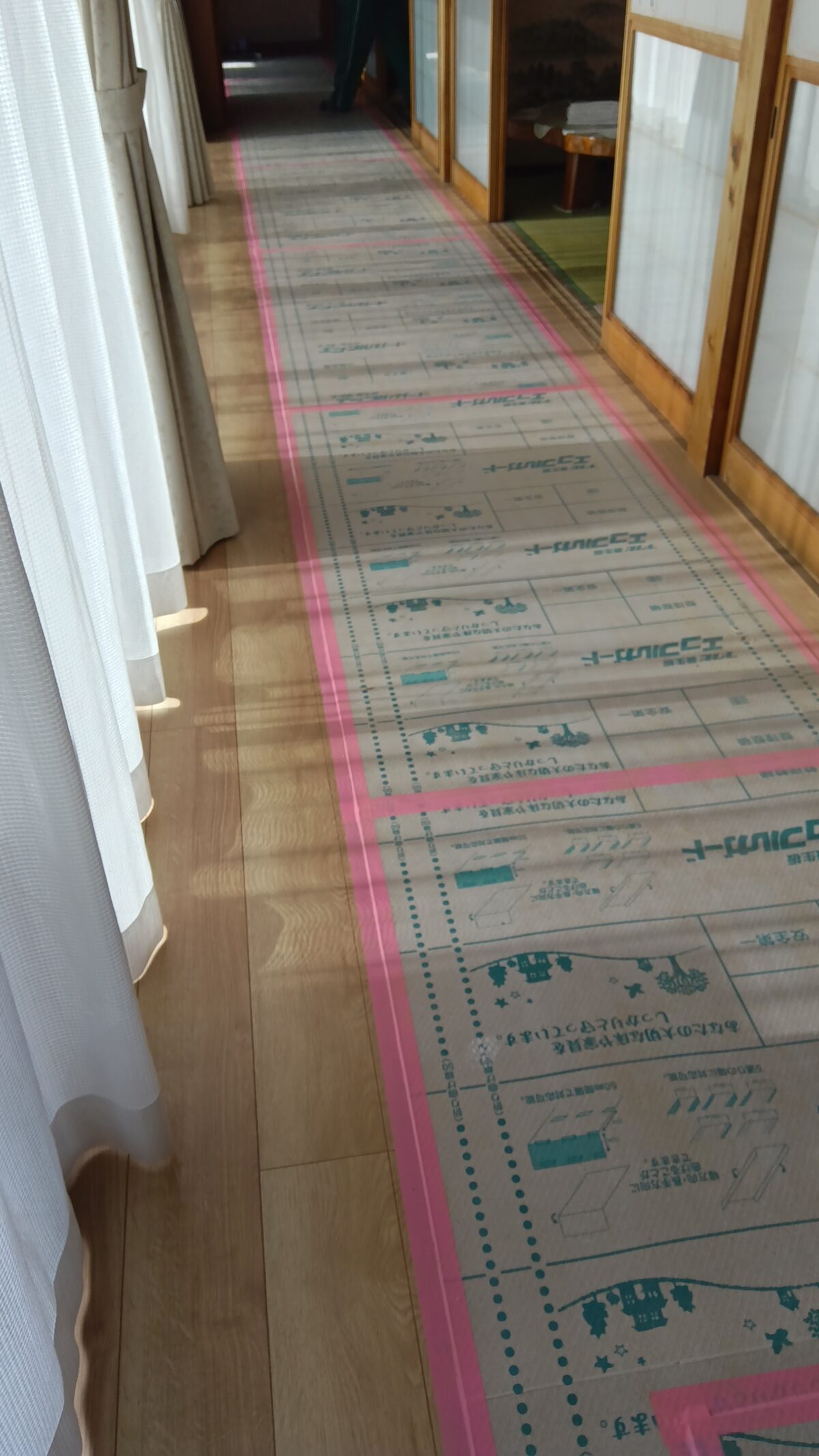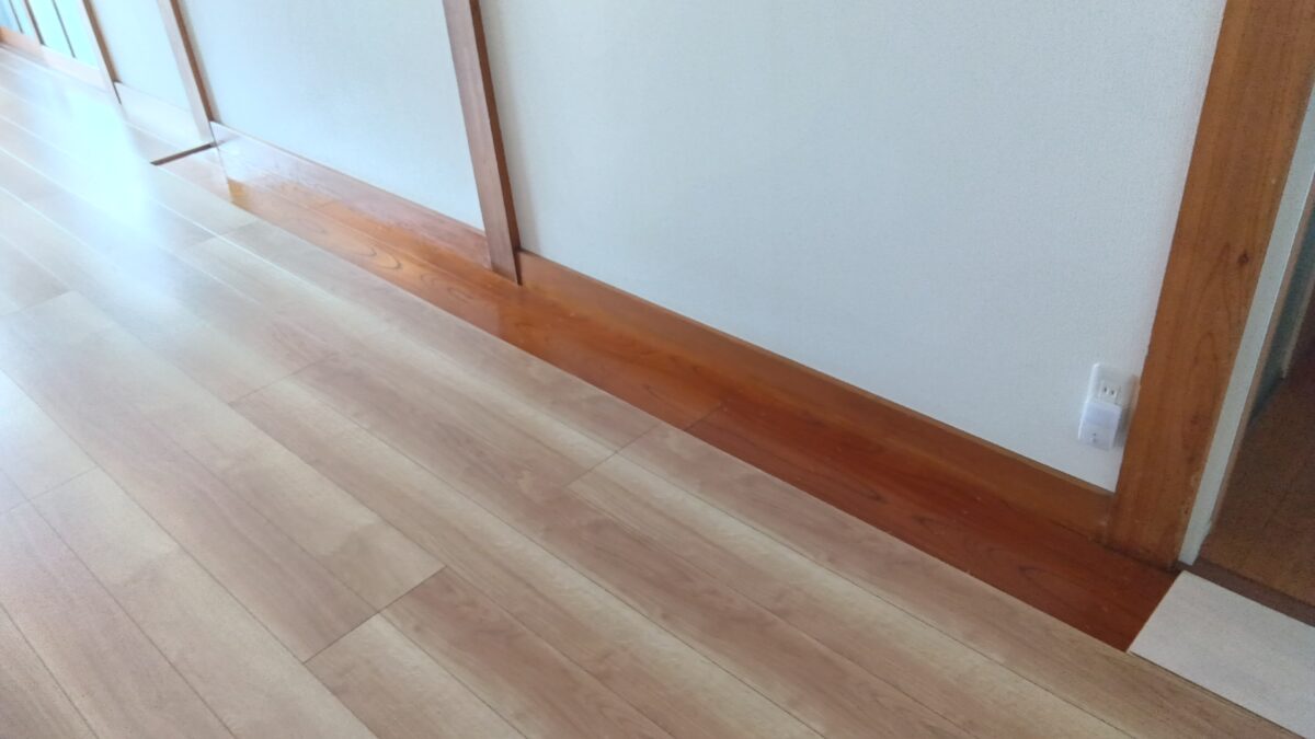 写真のように既存の床の上に強力なボンドで重ねて貼ることで、丈夫できれいな床になります。