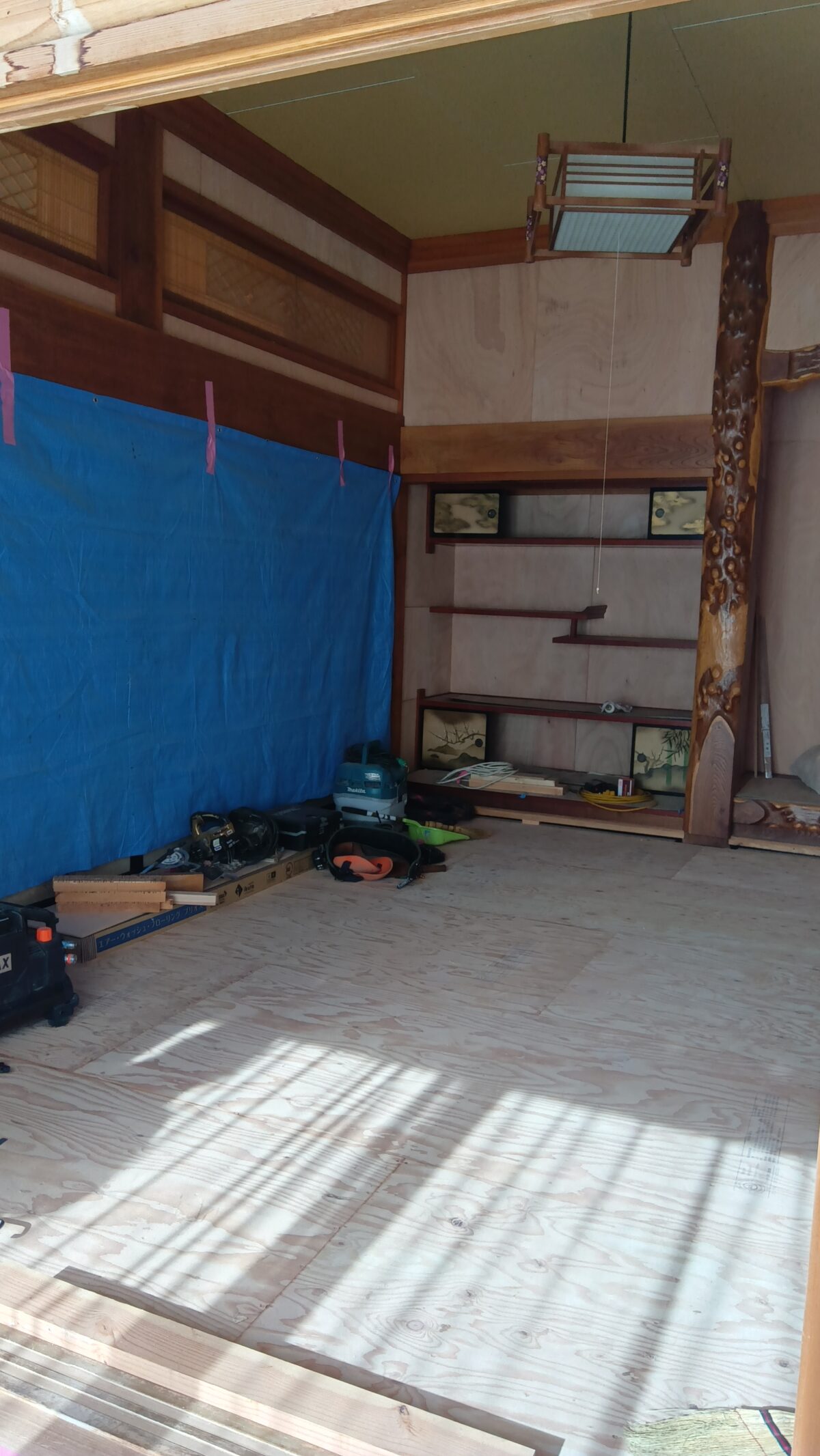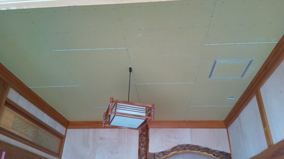 「座敷の床と天井の新設工事」「壁の内装クロス工事」「玄関ホールと縁側の床重ね貼り工事」の内部改装リフォームをさせていただいております。