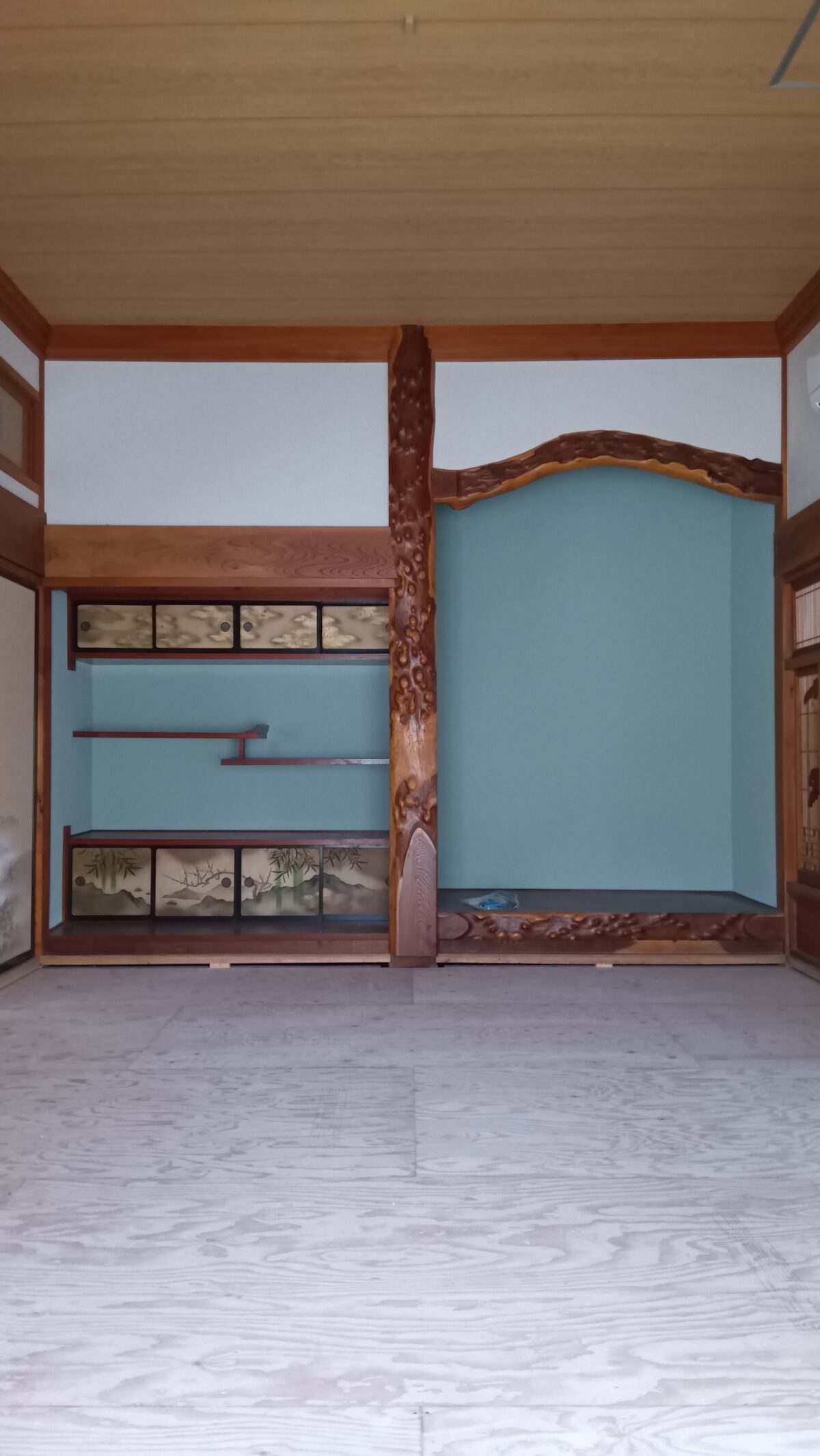 「座敷の床と天井の新設工事」「壁の内装クロス工事」の内部改装リフォームをさせていただいております。