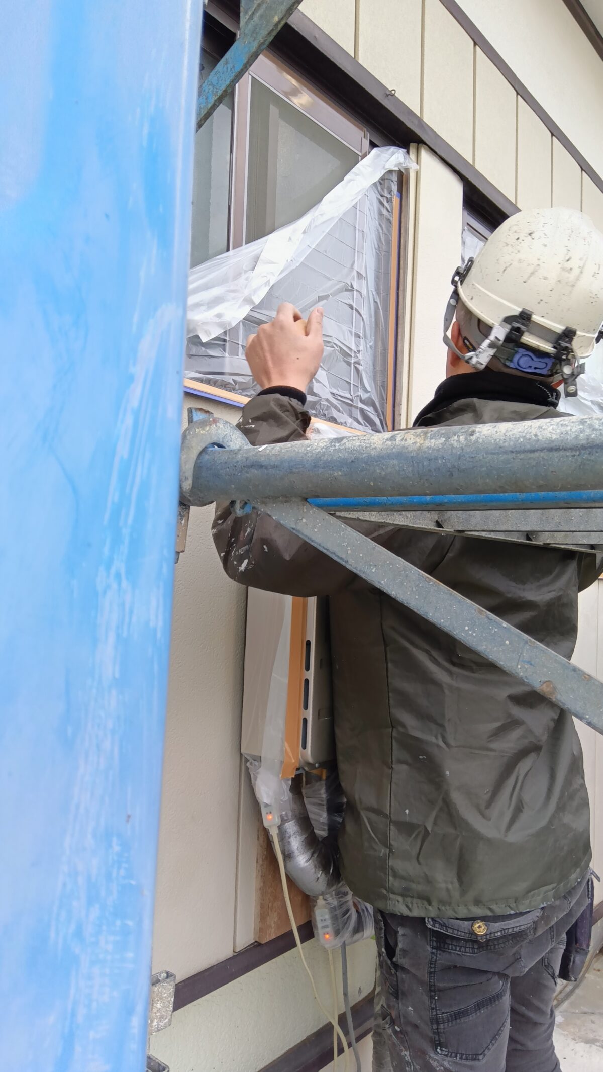 外壁洗浄後、サッシなどをしっかりと養生してから塗装に入ります。