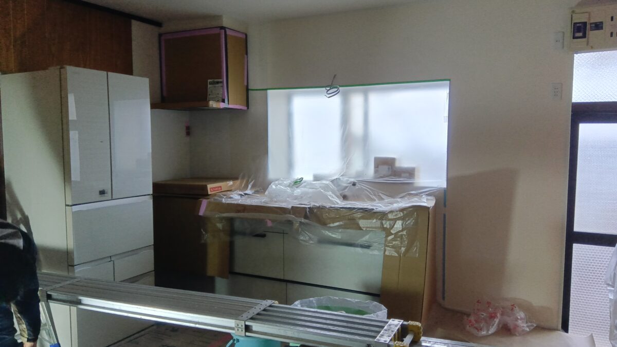 キッチンを設置し、壁・天井のクロス工事を行っています。