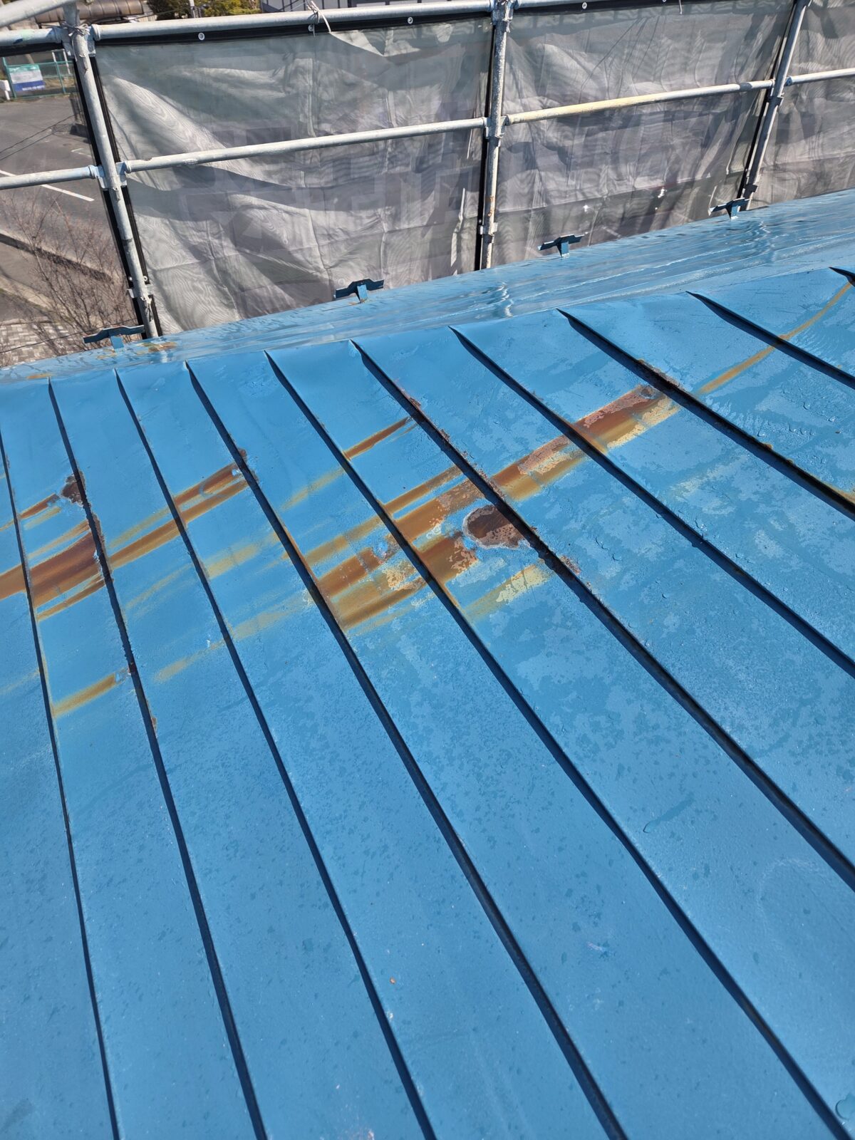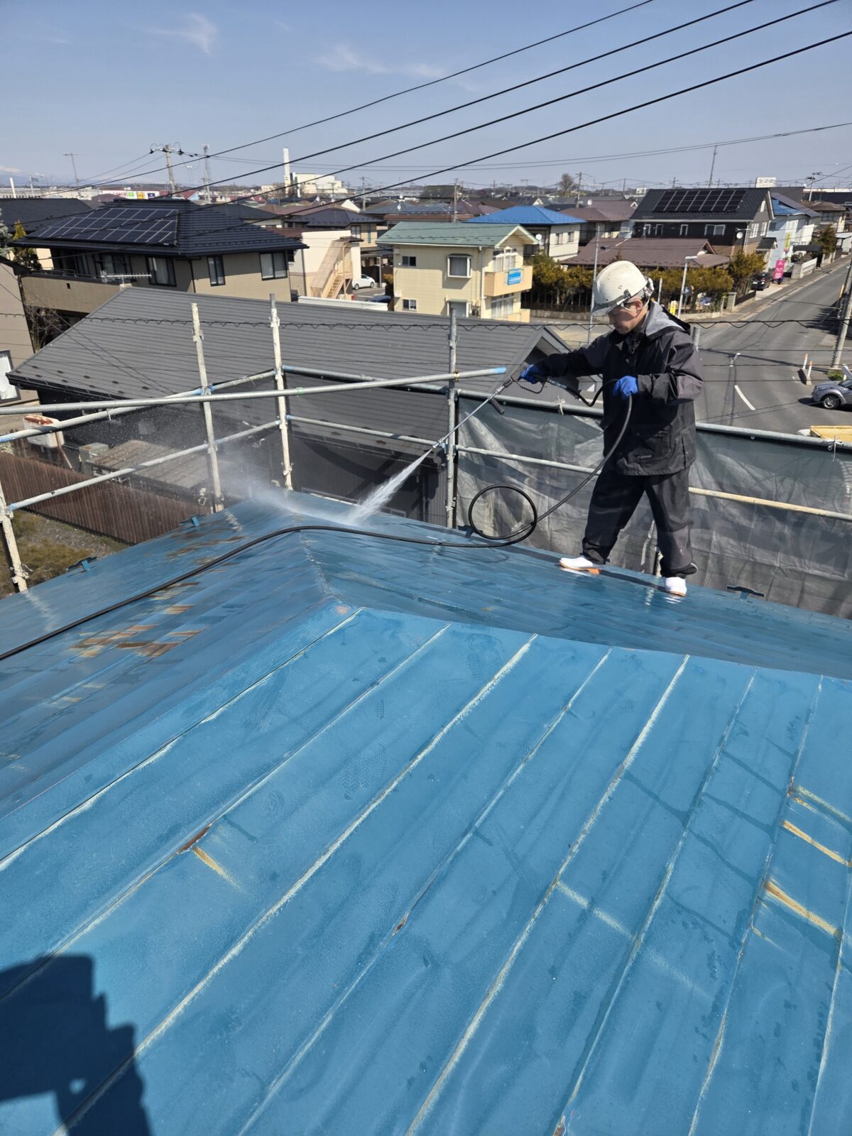 ケレン作業をした後、屋根の表面の汚れを高圧洗浄で洗い流します。