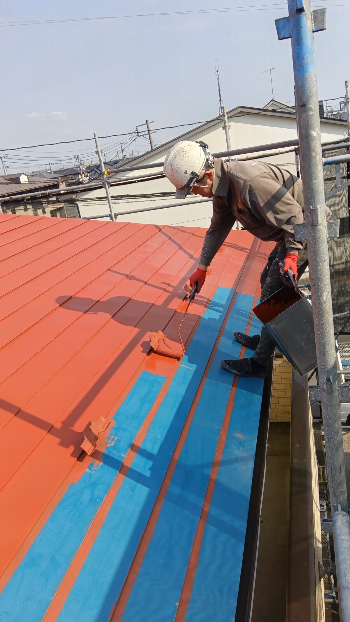 ケレン作業・高圧洗浄を行ったあと、サビ止め塗料を塗布します。