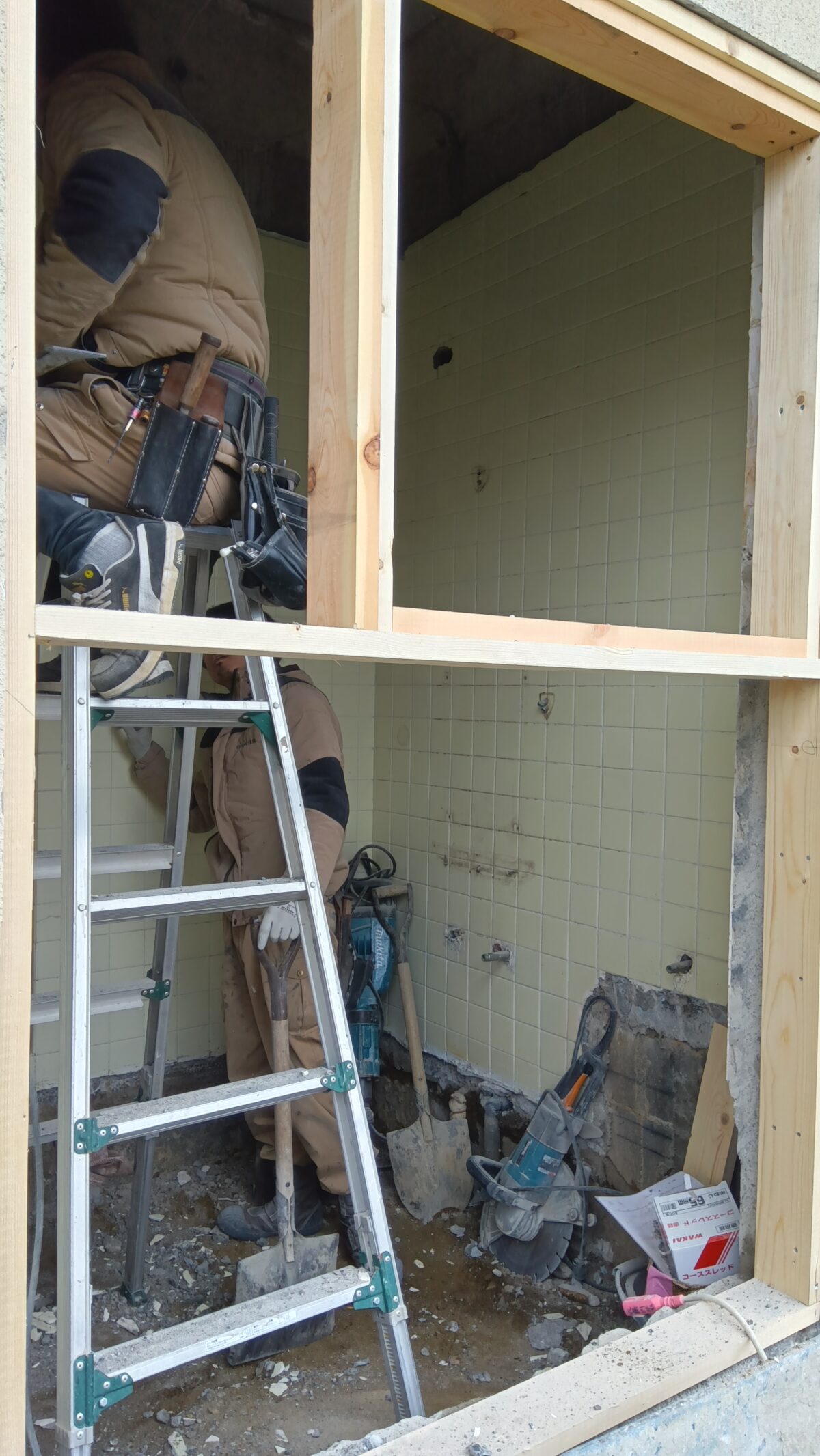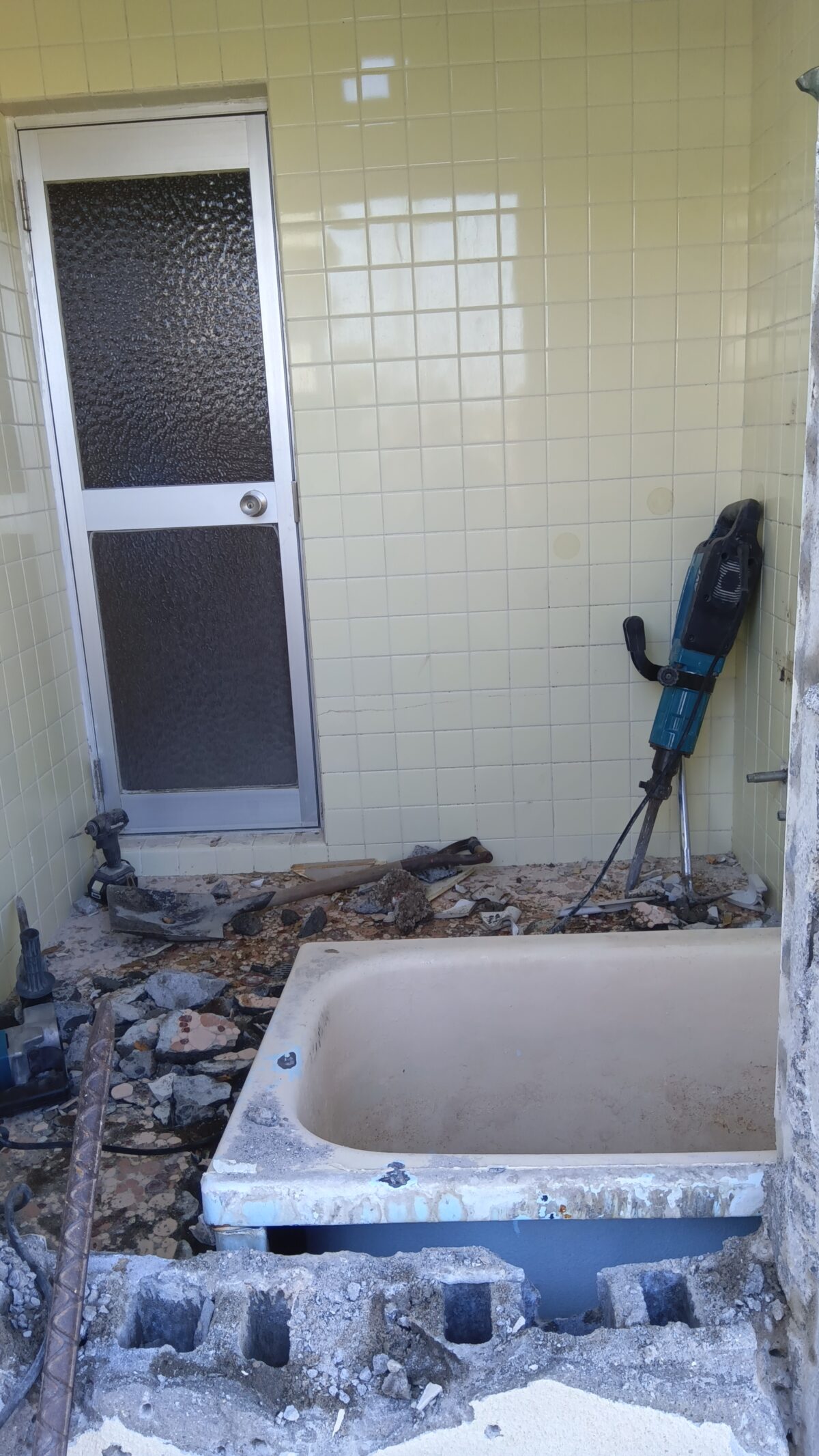 お風呂とキッチン交換工事 お風呂とキッチン交換工事 遠田郡美里町北浦地区 A様邸 お風呂とキッチンの交換工事、玄関&キッチンの床重ね貼り工事をさせていただいております。 既存の浴槽を撤去し、お風呂のタイル壁を解体しました。 2026年03月3日